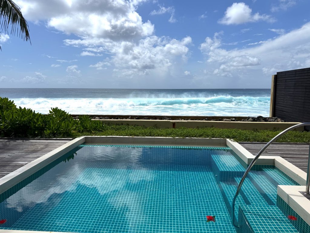 The interiors are beautlifully designed, airy and uncluttered, while outside, the private deck becomes the focal point of daily life — a place for morning coffees as the lagoon shifts from pale aquamarine to deeper blue, for sunbathing in complete tranquility, or simply for watching waves ripple gently against the shore. The pool is large and practical with steps to enter and sit on when you don’t fancy a full dip. Bathrooms are beautifully laid out, featuring outdoor showers and deep soaking tubs that allow guests to unwind with the sound of the sea. We particularly loved our villa for its stunning interior design, large pool, ocean view and sounds of the waves, and found it incredibly relaxing.